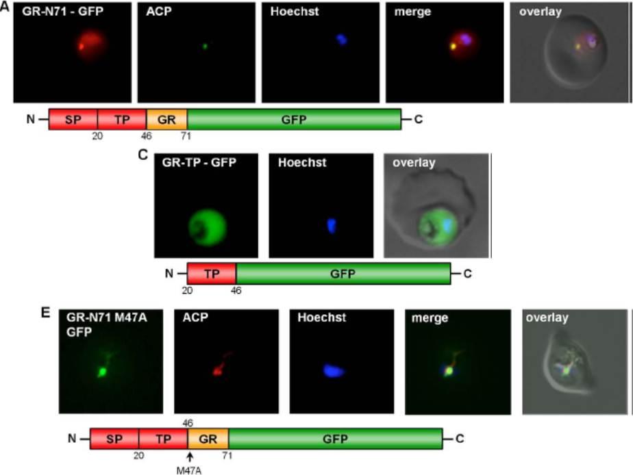 Dissection of the dual localization of P. falciparum GR. (A) Dual localization (cytosol and apicoplast) of GR-N71-GFP effected by a newly discovered N-terminal extension/leader. (C) Cytosolic targeting of a construct lacking the signal peptide (GR-TP-GFP). (E) Apicoplast targeting of construct (A) after mutation of methionine 47 to alanine (GR-N71-GFP M47A). Kehr S, Sturm N, Rahlfs S, Przyborski JM, Becker K. Compartmentation of redox metabolism in malaria parasites. PLoS Pathog. 2010 6:e1001242.