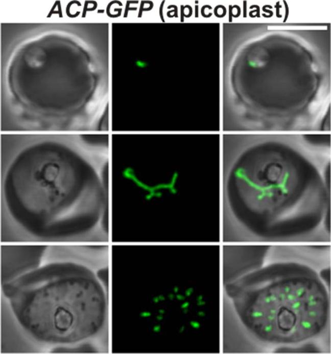 Confocal fluorescence microscopy images of transfected 3D7 P. falciparum-infected RBCs expressing a GFP chimera directed to the apicoplast. DIC image, the GFP fluorescence signal and an overlay of a P. falciparum acyl carrier protein-GFP transfectant. Scale bar = 5 µm. Apicoplasts are observed as small, rounded organelles (top row) in the ring stages that become elongated in the trophozoite stages (middle row) and forms contact points with the branched mitochondrion. The bottom row represents a schizont, where apicoplast division occurs. Apicoplast division occurs before mitochondrial division.Tilley L, McFadden G, Cowman A, Klonis N. Illuminating Plasmodium falciparum-infected red blood cells. Trends Parasitol. 2007 23:268-77. Copyright Elsevier 2009.