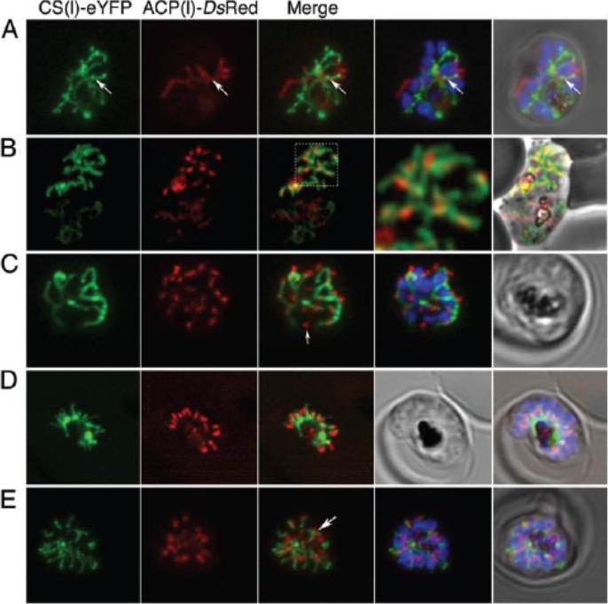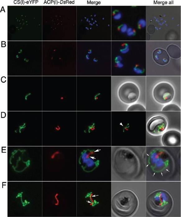 The relationship between the apicoplast and the mitochondrion throughout the intraerythrocytic cycle. The apicoplast remains round- or ovoid-shaped from the merozoite stage (A) into ring (B) and trophozoite stages (C), whereas the mitochondrion appears as a rod-shaped organelle (A–C). By early schizogony, the mitochondrion is predominantly branched and the apicoplast elongated (D–F). The second panel from the right in D shows a single optical section of the merged image, showing a single point of contact between the two organelles (arrow). Such points of connection are also apparent in E (two points of contact; arrows) and F (two points of contact: arrows). The mitochondrion frequently associates with the plasma membrane (arrows in E, right panel). Citrate synthase (CS) is a mitochondrial marker. Acyl carrier protein (ACP) is an apicoplast marker.van Dooren GG, Marti M, Tonkin CJ, Stimmler LM, Cowman AF, McFadden GI. Development of the endoplasmic reticulum, mitochondrion and apicoplast during the asexual life cycle of Plasmodium falciparum. Mol Microbiol. 2005 57:405-19.