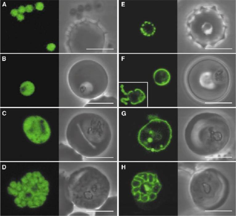 Plasmodium falciparum expressing ACPtransit-GFP (A-D) and ACPsignal-GFP (E-H). ACPtransit-GFP expression results in cytoplasmic GFP in merozoites (A) through to schizonts (D). GFP is apparently excluded from the food vacuole (B, C) and other organelles. ACPsignal-GFP expression results in in GFP export to the parasitophorous vacuolar space. Newly invaded ring parasites (E) show punctuate fluorescence in the parasitophorous vacuole which may indicate some early formative stage of this specialized structure. Subsequent stages show continuous fluorescence surrounding the parasite (F, G) which ultimately delineates the products of schiziogony (H). GFP is also seen in the tubulovesicular network [(F), inset]. Some internalized GFP probably represents protein that re-enters the parasite in food vacuoles. Scale bar 5 mm.Waller RF, Reed MB, Cowman AF, McFadden GI. Protein trafficking to the plastid of Plasmodium falciparum is via the secretory pathway. EMBO J. 2000 19:1794-802.