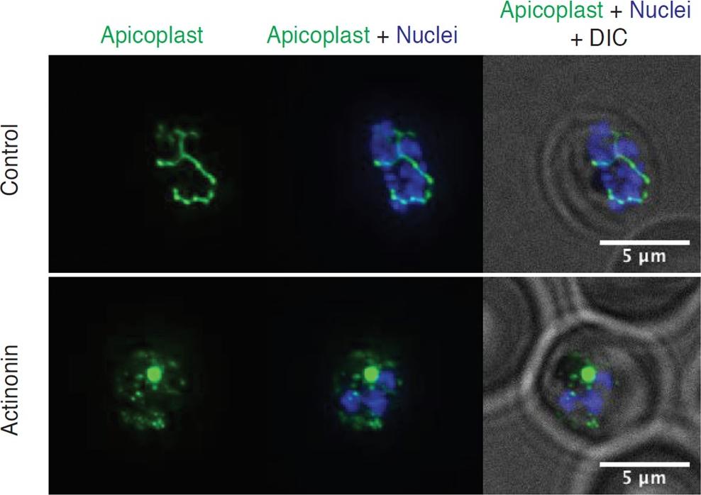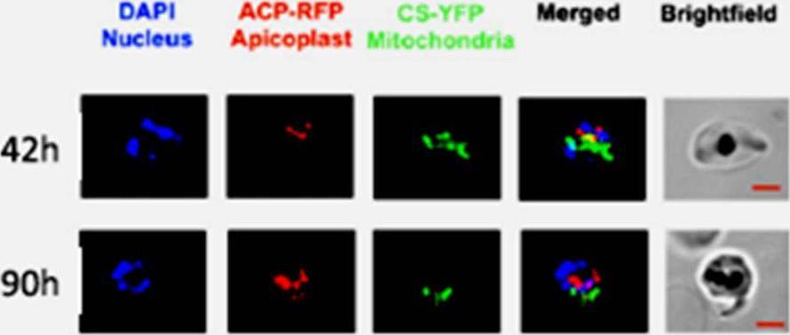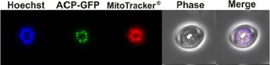 Widefield epifluorescence microscopy for the nucleus (Hoechst), apicoplast (ACP-GFP), and mitochondria (MitoTracker®619.Bowman JD, Merino EF, Brooks CF, Striepen B, Carlier PR, Cassera MB. Anti-apicoplast and gametocytocidal screening to identify the mechanisms of action of compounds within the Malaria Box. Antimicrob Agents Chemother. 2013 58(2):811-9