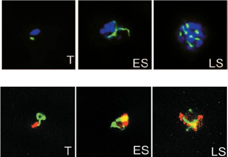 Upper panel: Parasites stably expressing the apicoplast targeted ACPl-GFP transgene were analyzed by fluorescence microscopy at trophozoite (T), early schizont (ES), and late schizont (LS) stages. The apicoplast appears green; nuclei are stained blue with DAPI.Lower panel: Dually transfected parasites expressing the mitochondrion-targeted CSl-YFP transgene and the apicoplast-targeted ACPl-DsRed transgene were analyzed by fluorescence microscopy at trophozoite (T), early schizont (ES), and late schizont (LS) stages are shown. The mitochondrion appears green, and the apicoplast appears red,Dahl EL, Shock JL, Shenai BR, Gut J, DeRisi JL, Rosenthal PJ. Tetracyclines specifically target the apicoplast of the malaria parasite Plasmodium falciparum. Antimicrob Agents Chemother. 2006 50:3124-31. PubMed PMID: