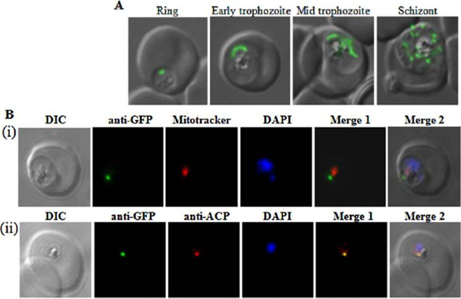 PfRRF1 localizes to the apicoplast.A. Live cell images of PfRRF1leader–GFPtransfected parasites at different stages of the erythrocytic cycle. Signals indicative of apicoplast morphology are seen in the ring,trophozoite and schizont stages.B. Immunolocalization of PfRRF1. Panel (i) shows a differential interference contrast (DIC) image, nuclear DNA staining with DAPI, PfRRF1leader–GFP fluorescence, MitoTracker signal, and their overlap. Panel (ii) showscolocalization of PfRRF1leader–GFP and the apicoplast marker ACP.Gupta A, Mir SS, Jackson KE, Lim EE, Shah P, Sinha A, Siddiqi MI, Ralph SA, Habib S. Recycling factors for ribosome disassembly in the apicoplast andmitochondrion of Plasmodium falciparum. Mol Microbiol. 2013 88(5):891-905.