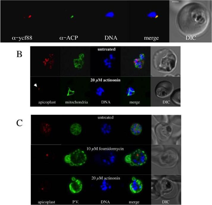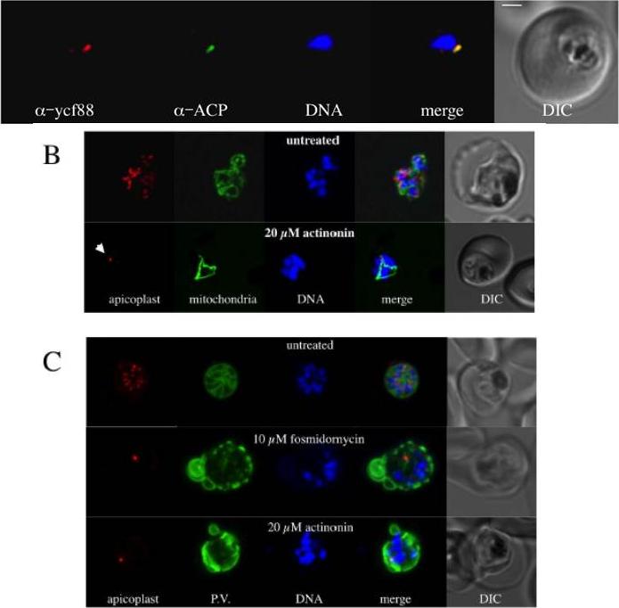 Localization in the apicoplast of an antigen recognised by PfYcf93 peptide antisera. PfYcf93 (red) localises to a small punctum that overlaps with the apicoplast marker acyl carrier protein (green) and sits beside the nucleus (blue) in a small, ring-stage parasite within a red blood cell. Bar = 1 mm. B. Effect of the putative post-translational inhibitor actinonin on biogenesis of the apicoplast, mitochondria and nuclei. Live cell imaging of untreated parasite with red fluorescent apicoplast, green fluorescent mitochondrion and blue fluorescent nuclei shows the normal branching/division of the apicoplast, elaboration of the mitochondrion and multiplication of the nucleus at the schizont stage. Actinonin-treated parasite at the same stage shows abranched mitochondrion and multiple nuclei but an undeveloped, stunted apicoplast (arrow). C) Effect of fosmidomycin and actinonin on the apicoplast and parasitophorous vacuole (P.V.) at the schizont stage. Immunofluorescence assay of untreated parasite with red fluorescent apicoplast (anti-ACP), green P.V. and blue fluorescent nuclei shows the segregation of the apicoplast, nuclei into distinct merozoites during late schizont stage. Actinonin or fosmidomycin treated parasites at the same stage show multiple nuclei but an undeveloped apicoplast and severe disruption of internal membrane structure in the parasite.Goodman CD, McFadden GI. Ycf93 (Orf105), a Small Apicoplast-Encoded Membrane Protein in the Relict Plastid of the Malaria Parasite Plasmodium falciparum That Is Conserved in Apicomplexa. PLoS One. 2014 Apr 4;9(4):e91178.