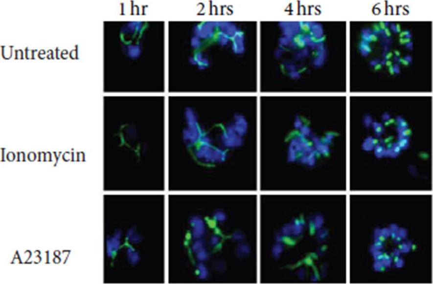 Apicoplast development and DNA replication are hardly inhibited by calcium ionophores. Fluorescence microscopy done on ACP-GFP expressing parasites indicates that ACP-GFP fusion protein (≈40 kDa) directed towards apicoplast has been imported and processed without much interference even after 6 hours post treatment.Cheemadan S, Ramadoss R, Bozdech Z. Role of Calcium Signaling in the Transcriptional Regulation of the Apicoplast Genome of Plasmodium falciparum. Biomed Res Int. 2014;2014:869401.