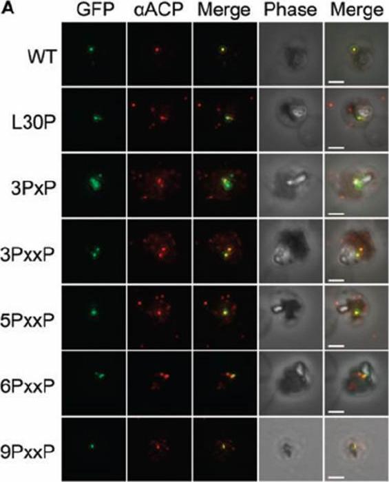 Colocalization of GFP constructs with endogenous ACP. αACP antibodies were affinity purified with the mature ACP domain to avoid cross-reactivity with the TP of ACP used in GFP fusions (26). GFP fluorescence was found to colocalize with αACP antibodies, demonstrating apicoplast localization. Scale bar = 2 μm. The 6PxxP mutation completely prohibits the formation of secondary structure in the TP. The 9PxxP construct disrupts secondary structure in the TP and the intervening region simultaneously without affecting protein localization. Substitution of 6 out of the 24 TP residues without perturbing trafficking to the apicoplast illustrates dramatic plasticity in TP recognition.Gallagher JR, Matthews KA, Prigge ST. Plasmodium falciparum apicoplast transit peptides are unstructured in vitro and during apicoplast import. Traffic. 2011 12(9):1124-38.
