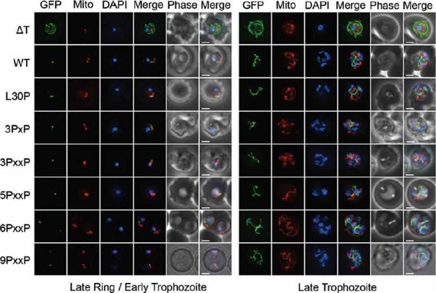 Subcellular location of mutant proline constructs. Epifluorescent images of live P. falciparum erythrocytic-stage parasites expressing GFP fused to proline mutants of the ACP leader peptide. The parasites were stained with mitotracker to identify mitochondria and DAPI to identify nuclei. GFP fluorescence in the ΔT construct is associated with the parasite periphery and compartments in the erythrocyte cytosol. For the WT construct and all proline mutant TP constructs, ring and early trophozoite-stage parasites show point-like GFP fluorescence as expected for apicoplast localization. Late trophozoite-stage parasites show a branched structure labeled by GFP which is distinct from the mitochondria, consistent with apicoplast localization. Image z-stacks were deconvoluted and then presented as a single combined image. Scale bar = 2 μm.Gallagher JR, Matthews KA, Prigge ST. Plasmodium falciparum apicoplast transit peptides are unstructured in vitro and during apicoplast import. Traffic. 2011 Sep;12(9):1124-38.
