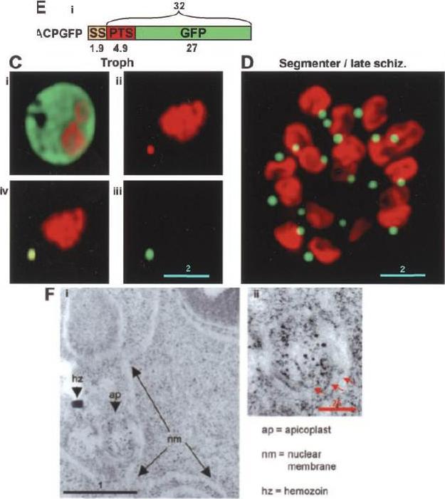 Detection of PTS-GFP using the co-transfection assay, its processing, and targeting of GFP to the plastid in P. falciparum. B, schematic of co-transfection assay. C and D, detection of green fluorescence in the plastid. Early trophozoite expressing cytosolic GFP (C, i) or apicoplast-targeted GFP (C, iii). Apicoplast DNA is shown in C, ii, and the merge of C, ii, and C, iii, is shown in C, iv. Segmenters/late schizonts expressing apicoplast targeted GFP (D). DNA was stained using Hoechst 33342 and images were captured using DeltaVision deconvolution fluorescence microscopy. Scale bar indicates 2 mm. F, i and ii: immunolocalization of GFP to the apicoplast in P. falciparum. ap, apicoplast; nm, nuclear membrane; hz, hemozoin. ii is an inset of i, indicating three membranes (shown by red arrows) surrounding the apicoplast. Scale bars indicate 1 and 0.25 mm for F, i, and F, ii, respectively. in early trophozoites (~24 h), cotransfectants with pHRPGFP show a cytosolic fluorescence, while those with pHRPACPGFP display green fluorescence (iii and iv) at a single perinuclear region (iii and iv). This co-localized with extrachromosomal DNA (ii and iv), consistent with GFP being delivered to the plastid.Cheresh P, Harrison T, Fujioka H, Haldar K. Targeting the malarial plastid via the parasitophorous vacuole. J Biol Chem. 2002 277(18):16265-77. PMID: