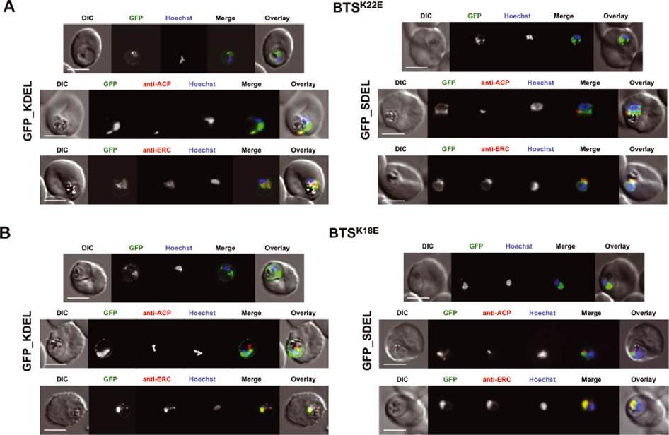 Analysis of ER retrieval strength compared to mutant transit peptides. A) Imaging of parasites expressing the K22E mutant form of ACP apicoplast leader sequence (BTSK22E) fused to GFP_KDEL (left panel) or GFP_SDEL (right panel). Upper panel: live-cell imaging; middle and lower panels: immunofluorescence assay using anti-PfACP or anti-PfERC. B) Imaging of parasites expressing the K18E mutant form of ACP apicoplast leader sequence (BTSK18E) fused to GFP_KDEL (left panel) or GFP_SDEL (right panel). Upper panel: live-cell imaging; middle and lower panels: immunofluorescence assay using anti-PfACP or anti-PfERC. Scale bar: 3 μm.Heiny SR, Pautz S, Recker M, Przyborski JM. Protein Traffic to the Plasmodium falciparum Apicoplast: Evidence for a Sorting Branch Point at the Golgi. Traffic. 2014 5(12):1290-304.