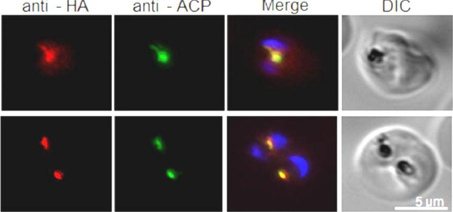 Indirect immunofluorescence assay of P. falciparum acetyl CoA carboxylase-haemagluttinin transgenic parasites showing localisation of P. falciparum acetyl CoA carboxylase in the apicoplast (green, P. falciparum acetyl CoA carboxylase-haemagluttinin labelled with anti-haemagluttinin antibody; red, apicoplast labelled with anti-Pf acyl carrier protein; blue, DNA stained with Hoechst 33342). Bar = 1 mm. The PfACC gene thus encodes an apicoplast-localised protein.Goodman CD, Mollard V, Louie T, Holloway GA, Watson KG, McFadden GI. Apicoplast acetyl Co-A carboxylase of the human malaria parasite is not targeted by cyclohexanedione herbicides. Int J Parasitol. 2014 Feb 25. pii: S0020-7519(14)00034-4. PMID: