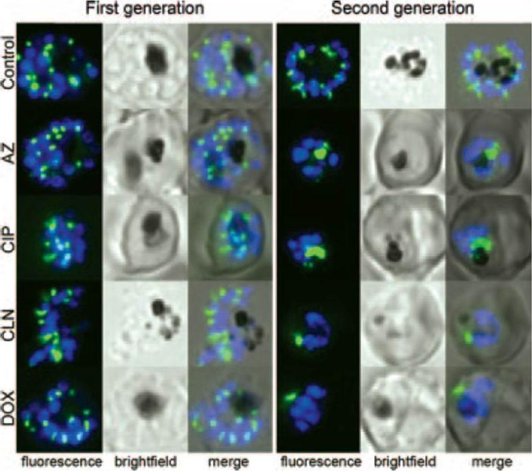 Apicoplasts distribute normally into the progeny of antibiotic-treated parasites but are abnormal in the following cycle. ACPl-GFP 3D7 strain transgenic parasites were treated with antibiotics at twice the IC50 at 96 h (100 nM azithromycin [AZ], 6 mM ciprofloxacin [CIP], 25 nM clindamycin [CLN], and 1 mM doxycycline [DOX]), and representative live parasites were imaged by fluorescence microscopy. GFP-labeled apicoplasts are green; Hoechst-stained nuclei are blue.Dahl EL, Rosenthal PJ. Multiple antibiotics exert delayed effects against the Plasmodium falciparum apicoplast. Antimicrob Agents Chemother. 2007 51(10):3485-90.