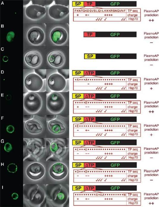 GFP targeting by mutant ACP transit peptides. (A) Apicoplast targeting of the wild-type ACP leader. (B) Cytosolic targeting of a construct lacking a signal peptide. (C) Secretion to the parasitophorous vacuole of a construct lacking a transit peptide. The substitutions introduced into mutants (D to I) are detailed in the accompanying panels at right (25), where a dot ( ) indicates no change. Check marks indicate putative Hsp70 binding sites. Predictions by the apicoplast protein predictor PlasmoAP are shown for each mutant. Internal labeling in (F) to (I) likely represents GFP in the food vacuole that has been taken up from the parasitophorous vacuole during phagocytosis.Foth BJ, Ralph SA, Tonkin CJ, Struck NS, Fraunholz M, Roos DS, Cowman AF, McFadden GI. Dissecting apicoplast targeting in the malaria parasite Plasmodium falciparum. Science. 2003 299(5607):705-8.
