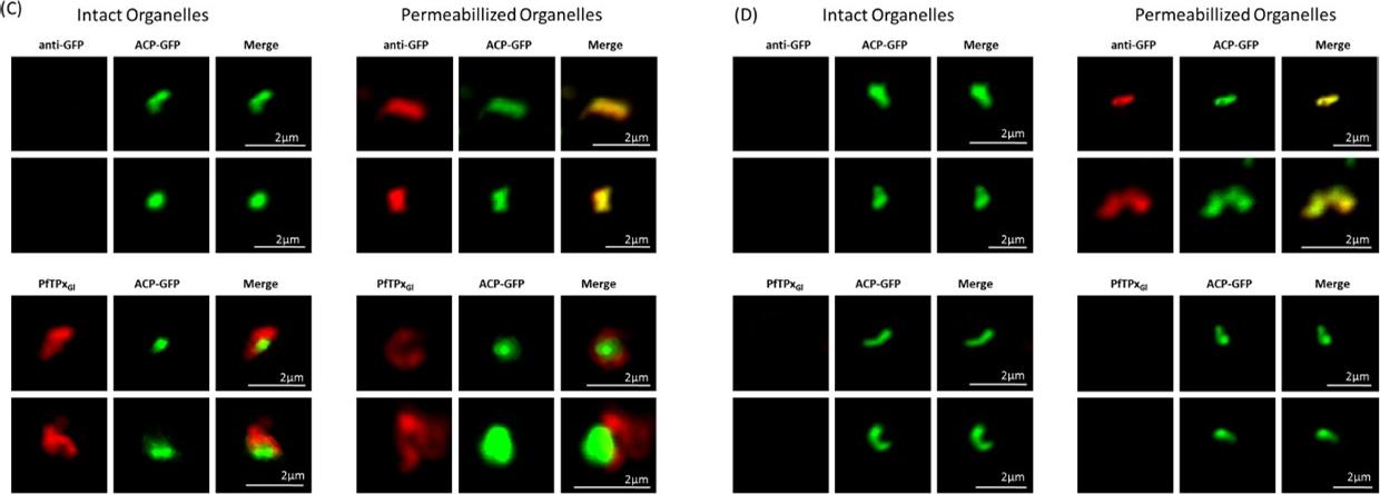 PfTPxGl localization to the outermost membrane of the apicoplast in D10-ACPleader-GFP parasites. (C) Localization of PfTPxGl to the membranes of intact/permeabilized apicoplasts from control parasites, (D) Absence of PfTPxGl in the membranes of intact/permeabilized apicoplasts from AlF4- treated parasites. Scale Bars as indicated in the figures. anti-GFP antibodies stained the apicoplast lumen (red signal) only in the permeabilized organelles, but not in the intact ones (C). This immunofluorescence signal colocalized with the intrinsic GFP fluorescence (green signal) of ACP-GFP. In both fractions, anti-PfTPxGl antibodies clearly showed staining surrounding the fluorescent signals from luminal ACP-GFP. While the size and morphology of free intact apicoplasts (based on ACP-GFP staining) remained unaltered, no peri-organellar PfTPxGl signal was observed in the immunofluorescence analysis of intact as well as permeabilized organelles, indicating the involvement of vesicles in the membrane targeting of this protein (D).Chaudhari R, Dey V, Narayan A, Sharma S, Patankar S. Membrane and luminal proteins reach the apicoplast by different trafficking pathways in the malaria parasite Plasmodium falciparum. PeerJ. 2017 Apr 27;5:e3128.