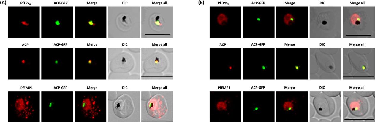 Immunofluorescence images show PfTPxGl, microtubules, ACP-GFP, PfACP and PfEMP1 trafficking in AlF4-treated D10-ACPleader-GFP parasites. (A) PfTPxGl, ACP-GFP, PfACP and PfEMP1 localization in control parasites, (B) PfTPxGl, ACP-GFP, PfACP and PfEMP1 localization in AlF4-treated parasites. For D10-ACPleader-GFP parasites, 98% of the 115 parasites analyzed showed disrupted PfTPxGl signal while 96% of the 147 parasites analyzed showed arrest of PfEMP1 in the parasites. Scale Bar: 10 mm. In control as well as in treated parasites, endogenous ACP colocalized perfectly with ACP-GFP signal suggesting that it was unaltered by the treatment. PfEMP1 was found both in the parasite and in punctate structures in the host RBC.Chaudhari R, Dey V, Narayan A, Sharma S, Patankar S. Membrane and luminal proteins reach the apicoplast by different trafficking pathways in the malaria parasite Plasmodium falciparum. PeerJ. 2017 Apr 27;5:e3128.