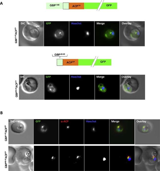 Both extended and shortened GBP130 signal peptides can replace the canonical signal peptide of an apicoplast protein. (A) Live cell imaging (B) Immunofluorescence. A schematic of each construct is shown above the respective images. DIC, differential interference contrast; GFP, green fluorescentprotein; Hoechst, nuclear staining. In merge and overlay: green, GFP; blue, Hoechst; red, anti-ACP. Traffic to the apicoplast is directed by an Nterminal canonical signal peptide which mediates entry into the secretory pathway, followed by a so-called transit peptide which is required for transport across the remaining apicoplast membranes. We wished to understand whether recessed signal peptides may target a sub-domain of the ER responsible for export to the host cell, or whether all proteins enter the secretory system at the same point. We thus generated parasites expressing the first 65aa of GBP130 fused to a transit peptide derived from acyl carrier protein (ACP). Additionally, we also fused the transit peptide to the C- domain of GBP130 (aa48-65). In both cases we could observe a mixed fluorescent phenotype, with a small bright “dot” within the parasite, and additionally a circular rim of fluorescencesurrounding the parasite (A, upper and lower panels). Analysisusing antisera against the apicoplast marker ACP verified the dotted fluorescence as the apicoplast. The fluorescence surrounding the parasite probably represents the lumen of the parasitophorous vacuole, the default target of secretory proteins lacking any further targeting signals.Meyer C, Barniol L, Hiss JA, Przyborski JM. The N-terminal extension of the P. falciparum GBP130 signal peptide is irrelevant for signal sequence function. Int J Med Microbiol. 2017 S1438-4221(17)30195-9.
