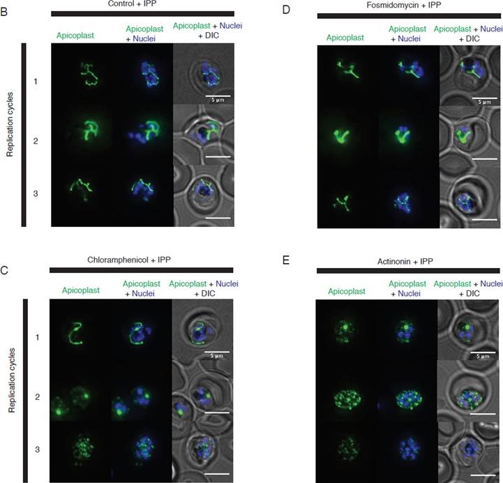 Representative images of the apicoplast during schizont stage of three successive replication cycles in untreated (b), chloramphenicol (c), fosmidomycin (d) and actinonin (e) treated cultures all grown with IPP. The apicoplast is visualized using the P. falciparum reporter strain D10 ACP-GFP in which GFP is targeted to the apicoplast and the nucleus is stained with Hoescht 33342. In this case, a branched apicoplast indicates successful apicoplast development while punctate apicoplasts (observed in replication cycle 1 for actinonin treatment (e) and replication cycle 2 for chloramphenicol treatment (c)) represents an apicoplast that has failed to develop. The apicoplast is no longer present after replication cycle 2 of actinonin treatment and upon replication cycle 3 of chloramphenicol treatment, which leads to complete mislocalization of the GFP.Amberg-Johnson K, Hari SB, Ganesan SM, Lorenzi HA, Sauer RT, Niles JC, Yeh E. Small molecule inhibition of apicomplexan FtsH1 disrupts plastid biogenesis in human pathogens. Elife. 2017 Aug 18;6. pii: e29865.