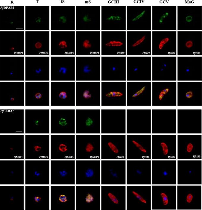 Protein expression profile of selected P. falciparum proteases. IFAs using polyclonal mouse antisera directed against 12 of the proteases was used to demonstrate protein expression in the asexual blood stages (R, ring; T, trophozoite; iS, immature schizont; mS, mature schizont) and gametocytes (GC stages III, IV and V) as well as in macrogametes (MaG) at 20 min post-activation (in green). The asexual and the sexual blood sstages were visualized via immunolabelling with polyclonal rabbit antisera against PfMSP1 and Pfs230, respectively (in red). Hoechst 33342 staining was used to highlight the parasite nuclei (in blue). Bar, 5 μm. Results are representative of three to four independent experiments.Weißbach T, Golzmann A, Bennink S, Pradel G, Julius Ngwa C. Transcript and protein expression analysis of proteases in the blood stages of Plasmodium falciparum. Exp Parasitol. 2017 Mar 25. [Epub ahead of print]