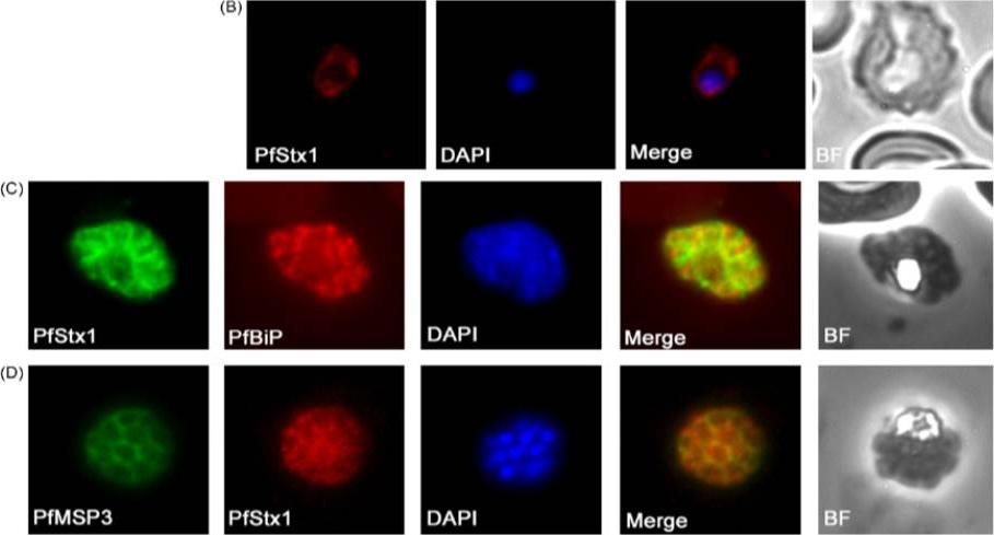 (B–D) Immunofluorescence microscopy of fixed smears of P. falciparum parasites using anti-PfStx1 antiserum. Secondary antisera (Molecular Probes) labeled with a fluorophore were used for visualization on an Olympus BX60 fluorescence microscope, and images were merged with Adobe Photoshop 5.0. In trophozoite stage parasites PfStx1 (red) has a plasma membrane like staining pattern and does not appear to be exported into the erythrocyte (B). In schizont stage parasites, PfStx1 (green) again has a peripheral location that is distinct from the ER marker PfBiP PFI0875w (in red) (C). PfStx1 (red) co-localizes with PfMSP3 (in green), a plasma membrane marker in schizont stage parasites (D), confirming its predicted location proximal to the plasma membrane.Parish LA, Rayner JC. Plasmodium falciparum secretory pathway: Characterization of PfStx1, a plasma membrane Qa-SNARE. Mol Biochem Parasitol. 2009 164:153-6. Copyright Elsevier 2009. PMID: