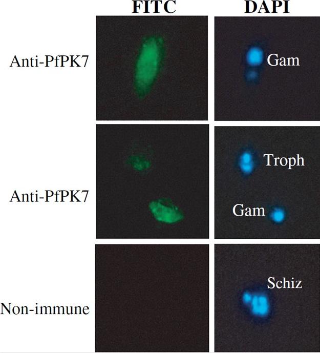 Immunofluorescence detection of PfPK7 expression during erythrocytic development. The IgY against a peptide derived from PfPK7 (see Experimental procedures) and a FITC-conjugated secondary antibody were used to investigate the localization of PfPK7 during erythrocytic development. The slides were pre-stained with DAPI to visualize nuclear DNA. Gam, gametocyte; Troph, trophozoite; Schiz, schizont. Immunofluorescence microscopy using the anti-peptide antibody shows that the PfPK7 protein localizes throughout the cytoplasm of both asexual parasites and gametocytes, with some punctuated pattern apparent in the latter, which has not yet been investigated further.Dorin D, Semblat JP, Poullet P, Alano P, Goldring JP, Whittle C, Patterson S, Chakrabarti D, Doerig C. PfPK7, an atypical MEK-related protein kinase, reflects the absence of classical three-component MAPK pathways in the human malaria parasite Plasmodium falciparum. Mol Microbiol. 2005 55:184-96.