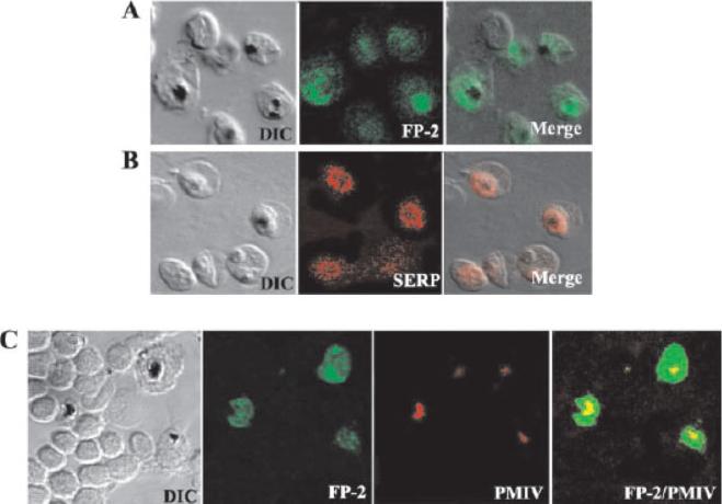 Immunolocalization of FP-2 by confocal microscopy. Erythrocytes infected with P. falciparum trophozoites were smeared on a glass slide, fixed with ice-cold methanol, and incubated with polyclonal FP-2 (A) or SERP (B) antibodies followed by Alexa 488 (green) or Alexa 594 (red) conjugated goat anti-rabbit IgG. Merged images of differential interference contrast (DIC) and fluorescence microscopy are shown on the right. C and D, slides were incubated with polyclonal FP-2 together with either plasmepsin IV (C) antibodies followed by Alexa-488-conjugated (green) goat anti-rabbit IgG and Alexa 594-conjugated (red) goat anti-mouse IgG. Merged images of green and red micrographs are shown on the right. The FP-2 antibody stained the entire trophozoite and vesicles or vesicle-like structures of unknown identity were seen extending into the erythrocyte cytoplasm. Co-staining of infected erythrocytes with antibodies to plasmepsin IV, which is present exclusively in the food, confirmed that FP-2 is present in the food vacuole as well as in the area that lies outside of the food vacuole (C). A comparison of FP-2 and SERP staining shows that the FP-2 is localized in the PVM as well as in a compartment that is distinct from the PVM.Dhawan S, Dua M, Chishti AH, Hanspal M. Ankyrin peptide blocks falcipain-2-mediated malaria parasite release from red blood cells. J Biol Chem. 2003 278:30180-6
