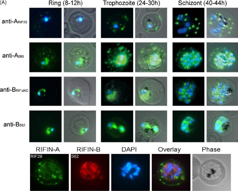 Indirect immunofluorescence assay in asexual stages of the FCR3S1.2 clone. A-type RIFINs identified by rabbit anti-A565 and rat anti-ARIF29, were found to be associated with the parasite and transported to the surface of infected erythrocytes via Maurer’s clefts. B-type RIFINs, identified by rabbit anti-B562 and mouse anti-BRIFDNC appeared to be mostly retained inside the parasite.Lower panel: A- and B-type RIFINs are both expressed in the same IE as detected by anti-ARIF29 (green) and anti-B562 (red) antisera, respectivelyPetter M, Haeggström M, Khattab A, Fernandez V, Klinkert MQ, Wahlgren M. Variant proteins of the Plasmodium falciparum RIFIN family show distinct subcellular localization and developmental expression patterns. Mol Biochem Parasitol. 2007 156:51-61. Copyright Elsevier 2009.