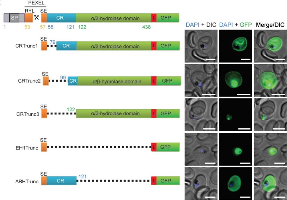 The charged region (CR) of PfEH1 is required for export, and the a/b-hydrolase region is required for cytoskeletal tethering. Schematic representing the PfEH1 truncation(Trunc) constructs. Each construct contains the N-terminal signal sequence and PEXEL motif, as well as a linker region (L) before the reporter GFP. SP, signal peptide. ABH, a/b-hydrolase. (Right) Images from IFA of paraformaldehyde/glutaraldehyde-fixed, trophozoite/early schizont-stage parasites expressing the truncated PfEH1 under control of the HSP86 promoter. The nuclei were stained with DAPI (blue). Bars = 5 mm. DIC, differential interference contrast.Spillman NJ, Dalmia VK, Goldberg DE. Exported Epoxide Hydrolases Modulate Erythrocyte Vasoactive Lipids during Plasmodium falciparum Infection. MBio. 2016 Oct 18;7(5). pii: e01538-16. PMID: 27795395