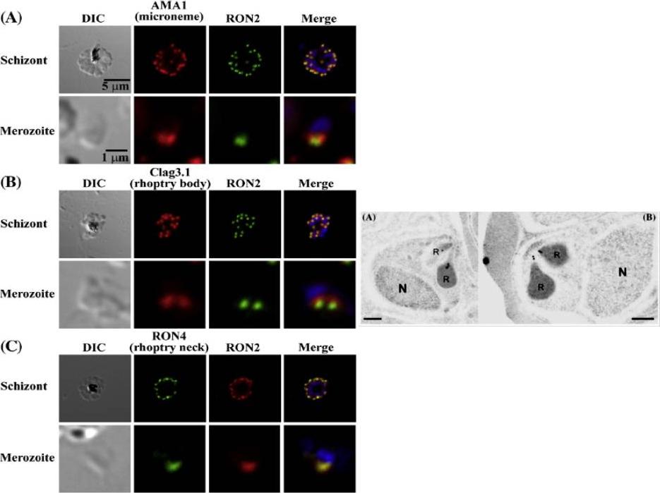 Left: PfRON2 is expressed at the apical end of Plasmodium merozoites. Schizont infected erythrocytes and merozoites were dual-labeled with antisera against PfRON2 and PfAMA1 PF11_0344 (A), PfClag3.1 PFC0110w (B), or PfRON4 PF11_0168 (C). Merged images are shown in the right panels. All segmented schizonts and merozoites are positive for PfRON2. Nuclei are counterstained with DAPI. Colocalization of PfRON2 with PfRON4 (rhoptry neck marker) was observed but neither colocalized with PfClag3.1 (rhoptry body marker) nor PfAMA1 (microneme marker). Right: Longitudinally sectioned merozoites in schizont-infected erythrocytes were labeled with anti-PfRON2 serum followed by secondary Ab conjugated with gold particles. Gold particles were restricted to the narrow neck portion of the rhoptries (R). Two different images are shown (A and B). N indicates nucleus. Bars=200 nm. Cao J, Kaneko O, Thongkukiatkul A, Tachibana M, Otsuki H, Gao Q, Tsuboi T, Torii M. Rhoptry neck protein RON2 forms a complex with microneme protein AMA1 in Plasmodium falciparum merozoites. Parasitol Int. 2009 58:29-35.