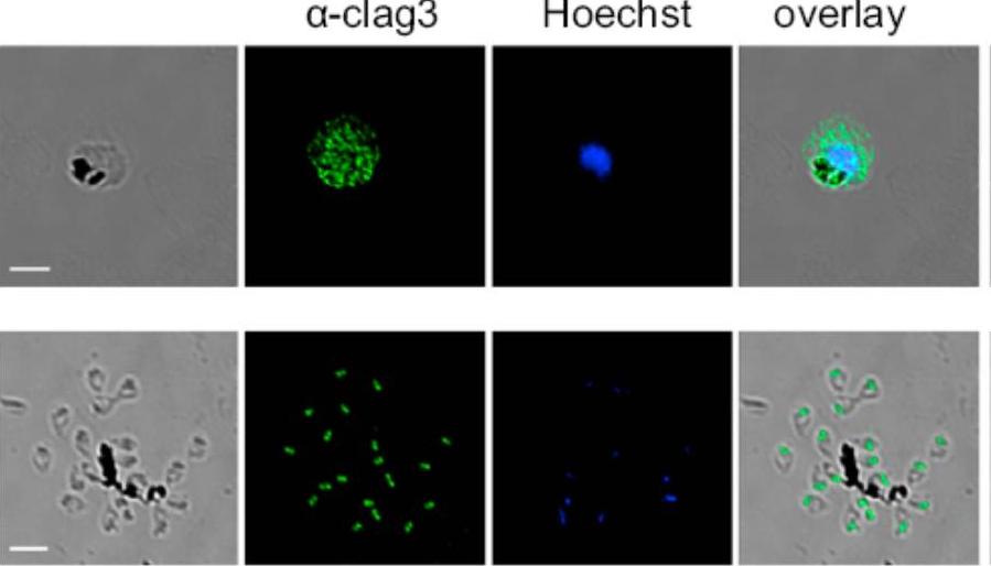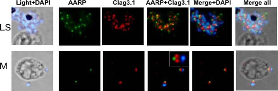Ppolyclonal antibodies to a carboxy-terminal recombinant fragment conserved between the two clag3 products were prepared. Confocal microscopy with this antibody confirmed reports localizing these proteins to the host cytosol and possibly the erythrocyte membrane as well as within rhoptries of invasive merozoites.Nguitragool W, Bokhari AA, Pillai AD, Rayavara K, Sharma P, Turpin B, Aravind L, Desai SA. Malaria parasite clag3 genes determine channel-mediated nutrient uptake by infected red blood cells. Cell. 2011 145:665-77.