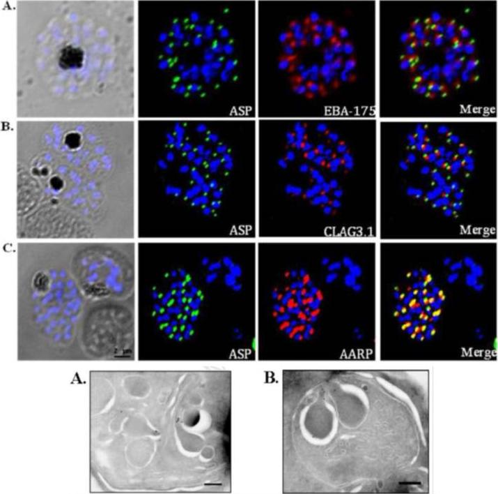 Co-localization of PfASP in late stage P. falciparum schizonts with microneme protein, EBA-175 (A); rhoptry bulb protein, Clag3.1 (B); and rhoptry neck protein, PfAARP (C). P. falciparum schizonts were stained with anti-PfASP-RIV mouse sera (green) and either anti-EBA-175 (red), anti-CLAG3.1 (red) or anti PfAARP (red) rabbit sera. Parasite nuclei were stained with DAPI (blue). PfASP did not co-localize with microneme protein EBA-175 or rhoptry bulb protein CLAG3.1 but co-localized with rhoptry neck protein PfAARP in segmented P. falciparum merozoites within late-stage schizonts. Bottom: Ultra thin sections of late-stage P. falciparum schizonts containing segmented merozoites were labelled with anti-PfASP-RIV mouse sera and gold-conjugated anti-mouse IgG. Labelling was observed in the neck of rhoptries in segmented merozoites of late-stage P. falciparum schizonts. Scale bar = 250 nm.Srivastava A, Singh S, Dhawan S, Alam MM, Mohmmed A, Chitnis CE. Localization of apical Sushi Protein in Plasmodium falciparum merozoites. Mol Biochem Parasitol. 2010 74(1):66-9 Copyright Elsevier2011