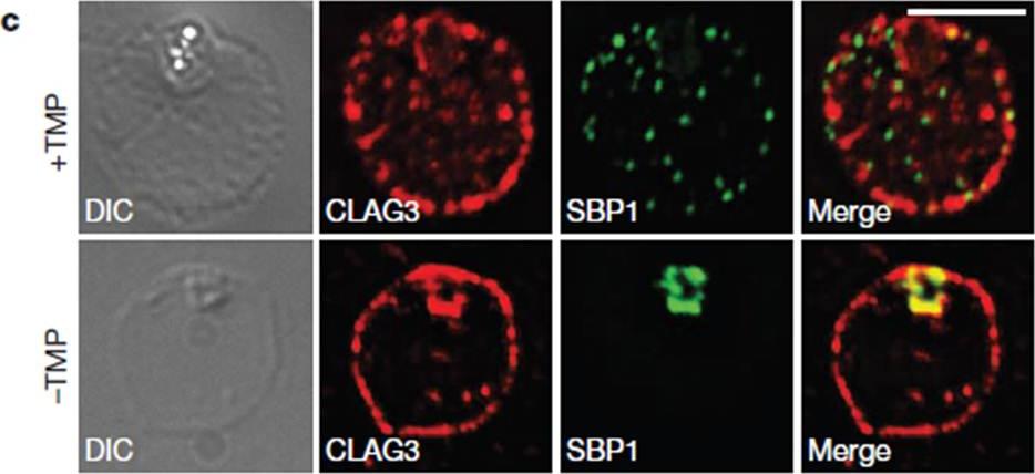 HSP101 is required for activation of PSAC but not trafficking of CLAG3 to the RBC periphery. CLAG3 proteins localize to the infected RBCperiphery and are the only parasite proteins known to be involved in PSAC activation IFA of ring-stage 13F10 parasites showing CLAG3 localization to the RBC membrane with or without TMP (DDD-stabilizing small molecule trimethoprim). TMP was removed in the late schizont stage and parasites were allowed to develop 18 h before fixation with 90% acetone/10% methanol. Scale bar, 5 mm. Beck JR, Muralidharan V, Oksman A, Goldberg DE. PTEX component HSP101 mediates export of diverse malaria effectors into host erythrocytes. Nature. 2014 Jul 16. [Epub ahead of print]