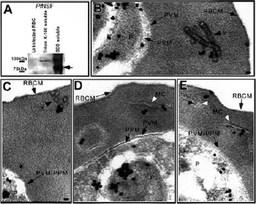 Pf NSF is associated with coated vesicles and Maurer clefts. (A) Western blot analysis of uninfected RBCs and IRBCs showed that Pf NSF was an approximate 89-kDa Triton X-100–insoluble, SDS-soluble protein that was absent in uninfected RBCs. Immunoelectron microscopy showed Pf NSF associated with (B) chains of coated vesicles in the RBC cytosol, black arrowhead, (C) coated vesicles closely apposed to the RBC membrane, black arrowhead, (D-E) the Maurer clefts, white arrowhead, (D) a large, double membrane structure in the RBC cytosol, and (E) transitional areas between a Maurer cleft and the RBC membrane. Scale bar 70 nm.Taraschi TF, O'Donnell M, Martinez S, Schneider T, Trelka D, Fowler VM, Tilley L, Moriyama Y. Generation of an erythrocyte vesicle transport system by Plasmodium falciparum malaria parasites. Blood. 2003 102:3420-3426.