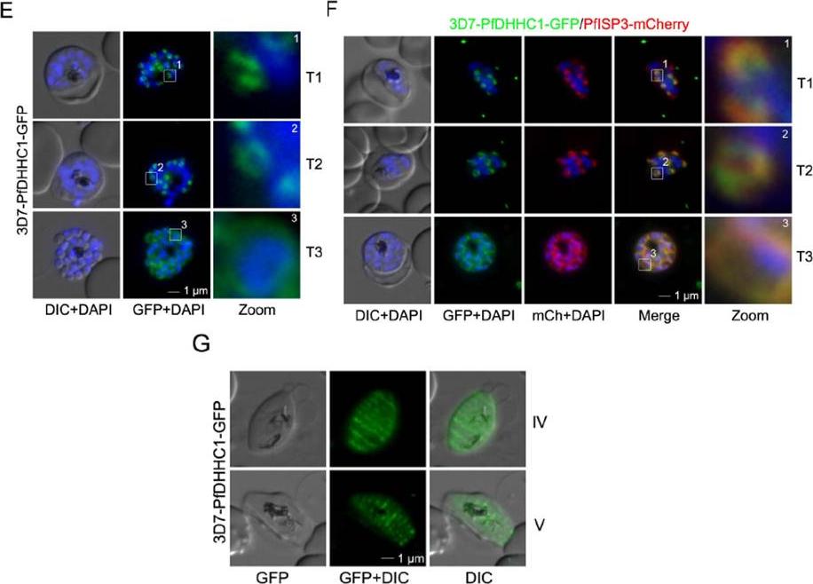 PfDHHC1 is an IMC localized palmitoyl acyltransferase. E. PfDHHC1-GFP was localized in unfixed late stage parasites showing characteristic IMC dynamics during schizogony (T1-T3). Nuclei stained with DAPI (blue). Enlargement of selected areas are marked with a white square and referred as zoom. Scale bar, 1 μm. F. Co-localization of PfDHHC1-GFP and PfISP3mCherry. PfISP3mCherry was episomally co-expressed and shows identical spatial distribution compared with PfDHHC1-GFP. G. PfDHHC1-GFP distribution within the nascent IMC during gametocytog-enesis (stage IV and V). These symmetric sutures of the IMC are expanding with ongoing growth of the IMC vesicles and maturation of the gametocytes (stage III and IV). Scale bars, 1 μm.Wetzel J, Herrmann S, Swapna LS, Prusty D, Peter AT, Kono M, Saini S, Nellimarla S, Wong TW, Wilcke L, Ramsay O, Cabrera A, Biller L, Heincke D, Mossman K, Spielmann T, Ungermann C, Parkinson J, Gilberger TW. The role of palmitoylation for protein recruitment to the inner membrane complex of the malaria parasite. J Biol Chem. 2014 Nov 25. PMID: