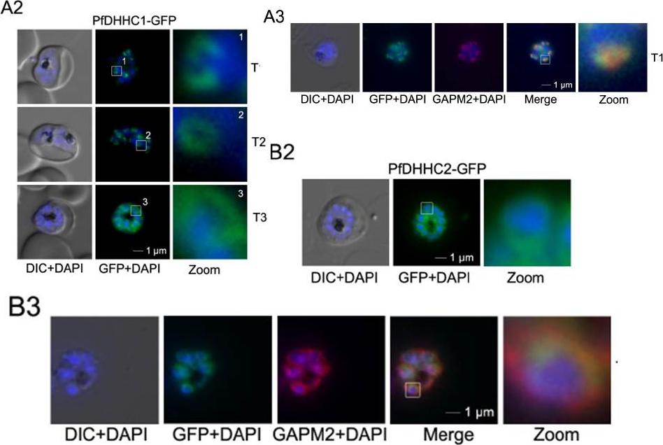 Over-expression and localization of PfDHHC1, PfDHHC2, PfDHHC3 and PFDHHC9 in late stage parasites. A. Expression of PfDHHC1-GFP. A2. Localization of PfDHHC1-GFP in unfixed parasites showing characteristic IMC dynamics during schizogony: Commencing as cramp-like structures (T1), transforming to small ring-shaped formations (T2) that towards the end of schizogony expand and are then equally distributed underneath the plasma membrane (T3). Nuclei are stained with DAPI (blue). Enlargement of selected areas are marked with a white square and referred to as zoom. Scale bar, 1 μm. A3. Co-localization with the IMC marker GAPM2 (anti-GAPM2, red) in fixed cells confirmed PfDHHC1-GFP IMC localization shown here in an early stage of TMC biogenesis (T1). B. Expression of PfDHHC2-GFP. B2. Live microscopy of PfDHHC2-GFP revealed a circular structure around the nucleus of the nascent merozoites reminiscent of the ER. Scale bar, 1 μm. Wetzel J, Herrmann S, Swapna LS, Prusty D, Peter AT, Kono M, Saini S, Nellimarla S, Wong TW, Wilcke L, Ramsay O, Cabrera A, Biller L, Heincke D, Mossman K, Spielmann T, Ungermann C, Parkinson J, Gilberger TW. The role of palmitoylation for protein recruitment to the inner membrane complex of the malaria parasite. J Biol Chem. 2014 Nov 25. PMID: