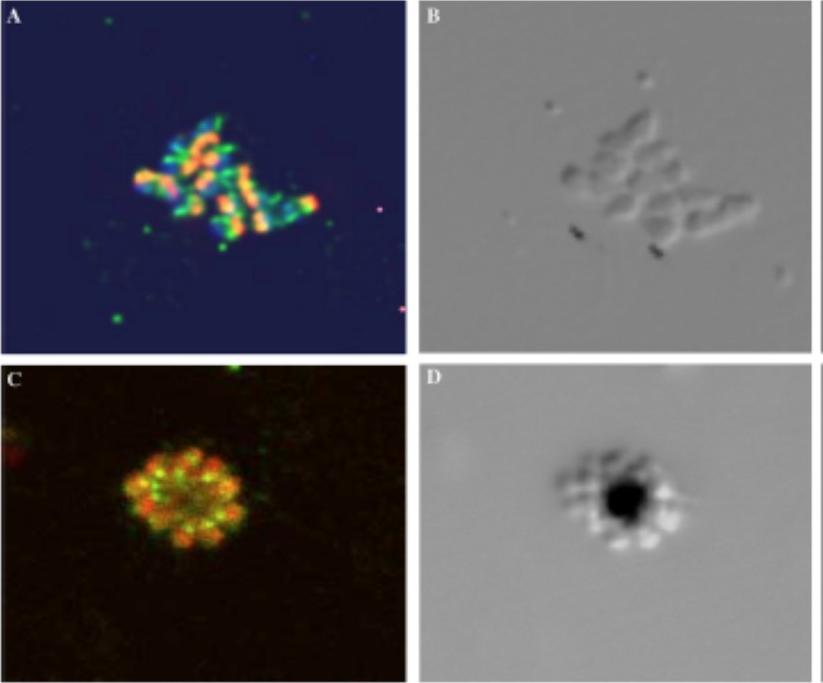 Confocal microscopy demonstrates the location of PfAnkDHHC posterior to apical organelles. (A) 3D7 merozoites were labeled with rat-antiPfAnkDHHC and Alexa-488 conjugated anti-rat IgG (green) and with anti-RAP-1 and Alexa-594 conjugated anti-mouse IgG (red). Nuclei were stained with DAPI and appear blue. (B) DIC image. (C) 3D7 merozoites in schizonts labeled with anti-PfAnkDHHC (green) and a mouse antisera recognizing subtilisin-2 (red). Merozoites attached to the pigment containing residual bodies have their apical end oriented opposite to the residual body. (D) DIC image corresponding to Fig. 2C. All images 630x.Seydel KB, Gaur D, Aravind L, Subramanian G, Miller LH. Plasmodium falciparum: characterization of a late asexual stage golgi protein containing both ankyrin and DHHC domains. Exp Parasitol. 2005 110:389-93. Copyright Elsevier 2010.