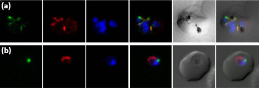 Plasmodium falciparum nuclear-encoded translation elongation factor (PfEF)-Ts detection and localisation. (A) PfEF-Ts is recognised in the parasite lysate in western blots using purified anti-PfEFTsexon1 antibody (Ab) (I). Both a larger (~46 kDa) and smaller (39 kDa) form are seen, likely representing a longer form without signal peptide, and a shorter form further processed to remove the transit peptide. No signal was observed when the parasite lysate was probed with pre-immune serum (PI). (B) The PfEF-Ts bipartite leader (amino acids 1-56) was fused to GFP and expressed from stable episomes in intraerythrocytic stages. (a) The PfEF-Tsleader-GFP (green) co-localised with antisera against the apicoplast protein ACP (red). In trophozoites (shown here) and schizonts, the PfEF-Tsleader- GFP labeled the branching, dividing and then segregating apicoplast. (b) Co-staining with mitochondrial dye mitotracker red. No localisation was observed between the PfEF-Tsleader-GFP (green) and Mitotracker (red), indicating that PfEF-Ts is solely targeted to the apicoplast. In both panels, the nucleus is stained using DAPI (blue). (C) Western blot of P. falciparum 3D7 cells transfected with the PfEF-Tsleader-GFP confirms N-terminal cleavage of the fusion protein. Anti-GFP antibody recognised 31 kDa and 28 kDa bands in transfected cells representing transit peptide containing GFP and the transit peptide-cleaved form with ~10 amino acids in front of GFP, respectively. No signals were observed in untransfected 3D7 cells or red blood cells (RBCs) alone. Biswas S, Lim EE, Gupta A, Mir SS, Siddiqi MI, Ralph SA, Habib S. Interaction of apicoplast-encoded elongation factor (EF) EF-Tu with nuclear-encoded EF-Ts mediates translation in the Plasmodium falciparum plastid. Int J Parasitol. 2010 41(3-4):417-27. Copyright Elsevier 2011