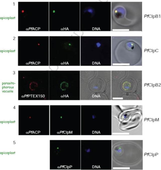 Localization of PfClpB1, PfClpC, PfClpB2, PfClpM, and PfClpP of P. falciparum was tested by immunofluorescent colocalization. In panels 1 and 2, PfClpB1-Strp-3×HA or PfClpC-Strp-3×HA parasites were probed with the apicoplast marker anti-ACP PFB0385w antisera (red), with anti-HA antisera (green), and with Hoescht 33342 to stain for DNA (blue). In panel 3, PfClpB2-Strp-3×HA parasites were probed with the parasitophorous vacuole marker anti-PTEX150 antisera (red), with anti-HA antisera (green), and with Hoescht 33342 (blue). In panels 4 and 5, wild type 3D7 strain was probed with anti-ACP antisera (red), with anti-PfClpM antisera or anti-ClpP antisera (green), and with Hoescht 33342 (blue). For all panels, the right most image represents the merged fluorescence images with the DIC or transmission image. The scale bars correspond to 5 mm.El Bakkouri M, Pow A, Mulichak A, Cheung KL, Artz JD, Amani M, Fell S, de Koning T, Goodman CD, McFadden GI, Ortega J, Hui R, Houry WA. The Clp chaperones and proteases of the human malaria parasite Plasmodium falciparum. J Mol Biol. 2010 404(3):456-77