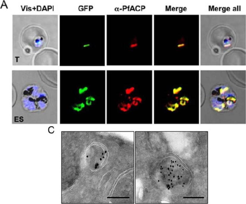 Immunofluorescence assay and immuno-electron microscopy to localize PfClpP. (A) Transgenic parasites expressing PfClpP-N-GFP were immuno-stained with antibodies specific to the apicoplast localized acyl carrier protein (ACP PFB0385w) (red). The parasite nuclei were stained with DAPI (blue) and slides were visualized by confocal laser scanning microscope. The PfClpP-N-GFP fusion protein and ACP were colocalized in the parasite apicoplast. (C) Localization of PfClpP by immuno-electron microscopy. Ultra thin sections of transgenic P. falciparum parasites expressing PfClpP-N-GFP were labeled with anti-GFP antibody and gold labeled secondary antibody. Labeling was observed in the apicoplast having characteristic four membranes. Scale bar = 250nm. Rathore S, Sinha D, Asad M, Böttcher T, Afreen F, Chauhan VS, Gupta D, Sieber S, Mohmmed A. A cyanobacterial serine protease of Plasmodium falciparum is targeted to the apicoplast and plays important role in its growth and development. Mol Microbiol. 2010 ) 77: 873–890.