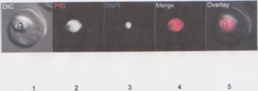 Detection of endogenous PfG in the erythrocytic stages. Indirect immunofluorescence using anti-PfG antisera: 1) Differential Interference Contrast Microscopy 2) Anti PfG Staining (PfG) 3) Staining with DAPI(40,6-Diamidin-2-phenylindol) 4) Merge of the two different stainings AK and DAPI 4) Overlay of both stainings. The cytosolic localization to the parasite is consistent with the lack of any known protein targeting motifs within the primary protein sequence, and the lack of any hydrophobic domains which may act as membrane anchors.Kaiser A, Langer B, Przyborski J, Kersting D, Krüger M. A Putative Non-Canonical Ras-Like GTPase from P. falciparum: Chemical Properties and Characterization of the Protein. PLoS One. 2015 Nov 5;10(11):e0140994.