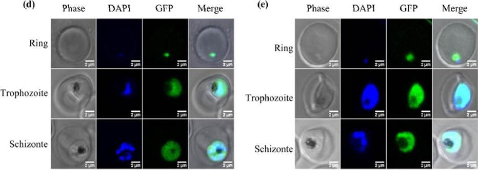 Expression and localization of PfPTPA-GFP (d) and PfPP2A-GFP (e) throughout the erythrocytic cell cycle of P. falciparum were analyzed by fluorescence microscopy after transfection. Examination of live parasites transfected with pfptpa-gfp showed that the signal was confined within the parasite where the distribution is nucleo-cytoplasmic in rings, trophozoites and schizonts (d), as the fluorescence partially overlapped DNA staining. Parasites transfected with the construct containing pfpp2a-gfp showed a nucleo-cytoplasmic distribution in rings and schizonts with an intense accumulation in the nucleus of late trophozoites.Vandomme A, Fréville A, Cailliau K, Kalamou H, Bodart JF, Khalife J, Pierrot C. PhosphoTyrosyl Phosphatase Activator of Plasmodium falciparum: Identification of Its Residues Involved in Binding to and Activation of PP2A. Int J Mol Sci. 2014 15(2):2431-53.