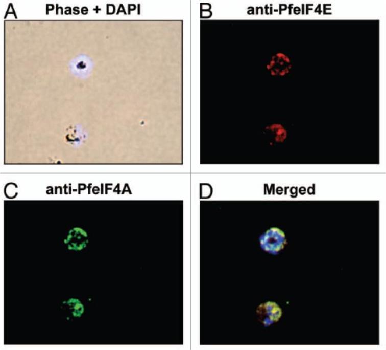 Immunofluorescence assay of PfeIF4E (B) and PfeIF4A (C) respectively in fixed parasite cultures showing co-localization (D). The fluorescence staining indicates that endogenous PfeIF4E and PfeIF4A (PfH45) co-localize and are distributed mainly in the cytoplasm in the parasite.Tuteja R, Pradhan A. PfeIF4E and PfeIF4A colocalize and their double-stranded RNA inhibits Plasmodium falciparum proliferation. Commun Integr Biol. 2010 3:611-3.