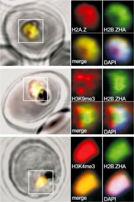 Immunofluorescence analysis of trophozoite stage parasites shows that Pf H2B.Z (green) is expressed in the nucleus and overlaps with PfH2A.Z and the histone modification H3K4me3, but not with the heterochromatin mark H3K9me3 (red). The DNA was labelled with DAPI(blue). Pf H2B.Z and Pf H2A.Z colocalize very well and thus occupy the same subnuclear region, which largely overlaps with the DAPI-stained DNA except for a small area in which alternative histone staining was less intense. Pf H2B.Z also colocalized with the euchromatin marker H3K4me3, but not with the heterochromatin marker H3K9me3.Petter M, Selvarajah SA, Lee CC, Chin WH, Gupta AP, Bozdech Z, Brown GV, Duffy MF. H2A.Z and H2B.Z double-variant nucleosomes define intergenic regions and dynamically occupy var gene promoters in the malaria parasite Plasmodium falciparum. Mol Microbiol. 2013 87(6):1167-82