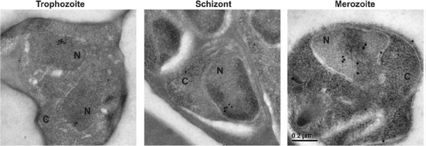 PfH2A.Z is present in the euchromatin compartment. Immunoelectronmicroscopy with anti-PfH2A.Z antibodies indicates nuclear compartmentalization of PfH2A.Z. N = nucleus, C = cytoplasm.Petter M, Lee CC, Byrne TJ, Boysen KE, Volz J, Ralph SA, Cowman AF, Brown GV, Duffy MF. Expression of P. falciparum var Genes Involves Exchange of the Histone Variant H2A.Z at the Promoter. PLoS Pathog. 2011 7(2):e1001292. 17.