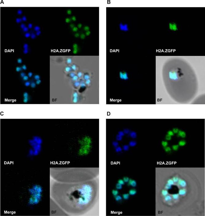 Nuclear localization of PfH2A.ZGFP. Confocal microscopy of PfH2A.ZGFP parasites at the (A) merozoite, (B) ring, (C) trophozoite and (D) schizont stage. Blue: DNA stained with DAPI. Green: PfH2A.ZGFP. Overlays in the lower panels in each picture demonstrate the nuclear localization of PfH2A.ZGFP. The transgenic P. falciparum ectopically expressing PfH2A.Z-GFP fusion proteins corroborated the sub-nuclear distribution of PfH2A.Z.Petter M, Lee CC, Byrne TJ, Boysen KE, Volz J, Ralph SA, Cowman AF, Brown GV, Duffy MF. Expression of P. falciparum var Genes Involves Exchange of the Histone Variant H2A.Z at the Promoter. PLoS Pathog. 2011 7(2):e1001292. 17.