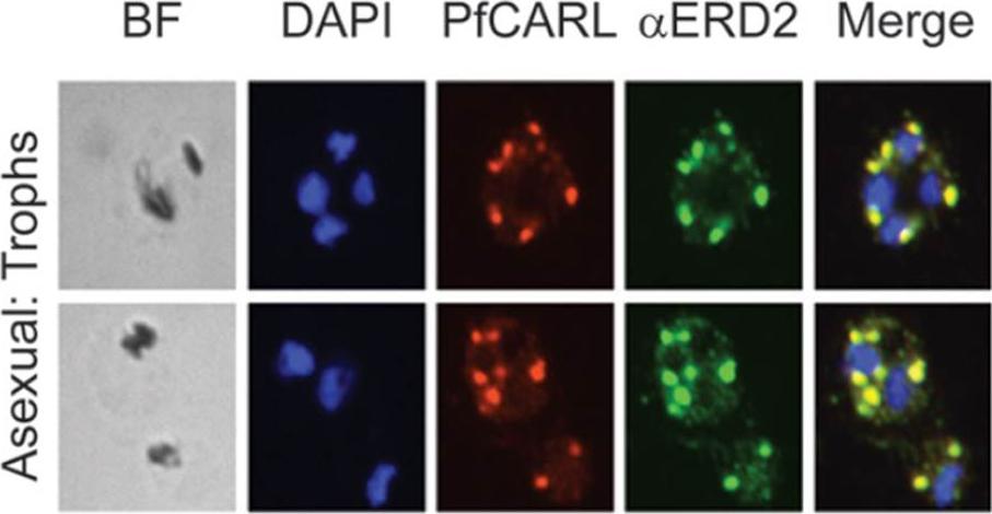 pfcarl is localized to cis-Golgi apparatus of P. falciparum asexual- and sexual-stage parasites. Immunofluorescence colocalization of PfCARL and ERD2 in two representative P. falciparum asexual parasites. BF, brightfield; DAPI, 4’, 6-diamidino-2-phenylindole; Trophs, trophozoites; PfCARL, antibody against PfCARL; aERD2, antibody against ER domain protein #2. The PfCARL overexpressing strains demonstrated colocalization of PfCARL with an anti-ERD2 (ER domain protein no. 2) antibody in several different asexual blood stages, which strongly indicated that PfCARL is localized to the cis-Golgi apparatus of the parasite.LaMonte G, Lim MY, Wree M, Reimer C, Nachon M, Corey V, Gedeck P, Plouffe D, Du A, Figueroa N, Yeung B, Bifani P, Winzeler EA. Mutations in the Plasmodium falciparum Cyclic Amine Resistance Locus (PfCARL) Confer Multidrug Resistance. MBio. 2016 Jul 5;7(4). pii: e00696-16.