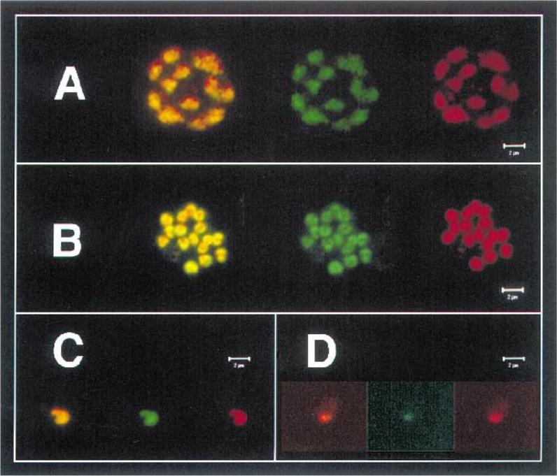 Localization of 6.1 products using confocal microscopy. A. Segmenters labelled with mouse anti-161 serum (left, superimposition; middle, FITC; right, propidium iodide). B. Segmenters labelled with mouse anti-261 serum. C. Ring stages labelled with mouse anti-161 serum D. Ring labelled with mouse anti-261 serum. The images obtained on segmenters (Fig. A and B for the anti-161 and anti-261 antisera respectively) indicated that 6.1 was a nuclear protein. Serial confocal images showed staining all over the nuclear mass, colocalized with the DNA. All schizonts stained with propidium iodide were labelled with the anti-161 and anti-261 sera, indicating expression of the 6.1 gene by all parasites. Both antisera also reacted with the nucleus of ring stages (Fig. C and D).Bischoff E, Guillotte M, Mercereau-Puijalon O, Bonnefoy S. A member of the Plasmodium falciparum Pf60 multigene family codes for a nuclear protein expressed by readthrough of an internal stop codon. Mol Microbiol. 2000 35:1005-16.