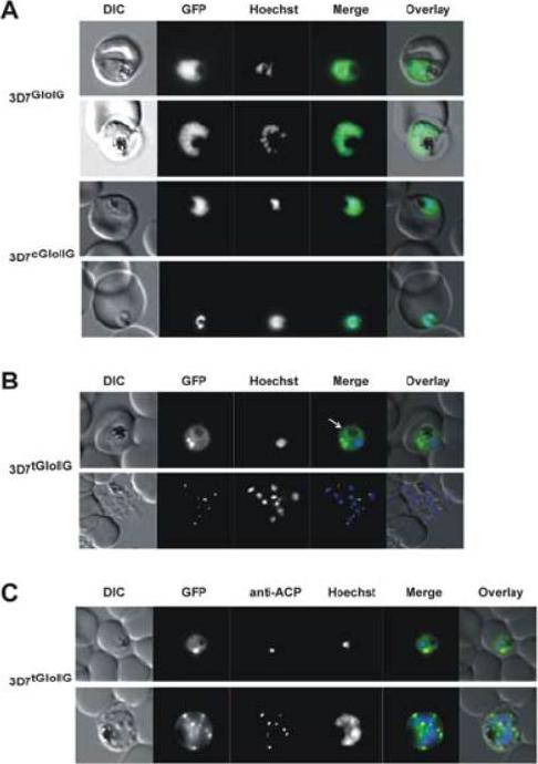 Localization of GloI, cGloII and tGloII GFP-fusion constructs in infectederythrocytes. (A) Live cell imaging of erythrocytes infected with transgenic parasite lines 3D7GloIG (upper panels) and 3D7cGloIIG (lower panels). GFP fluorescence was evident only within the body of the parasite (excluding the food vacuole). (B) Live cell imaging of erythrocytes infected with 3D7tGloIIG (apicoplast). A distinct fluorescent “dot” was seen in both trophozoite (upper panel) and merozoite (lower panel) stage parasites, indicative of an apicoplast localization. The white arrow shows additional low levels in the arasitophorous vacuole. (C) Colocalization of tGloIIGFP and the apicoplast marker ACP in fixed, immunodecorated cells. Note the high degree of overlap between tGloII-GFP and ACP.Urscher M, Przyborski JM, Imoto M, Deponte M. Distinct subcellular localization in the cytosol and apicoplast, unexpected dimerization and inhibition of Plasmodium falciparum glyoxalases. Mol Microbiol. 2010 76:92-103. Copyright John Wiley & Sons Ltd. 2010.