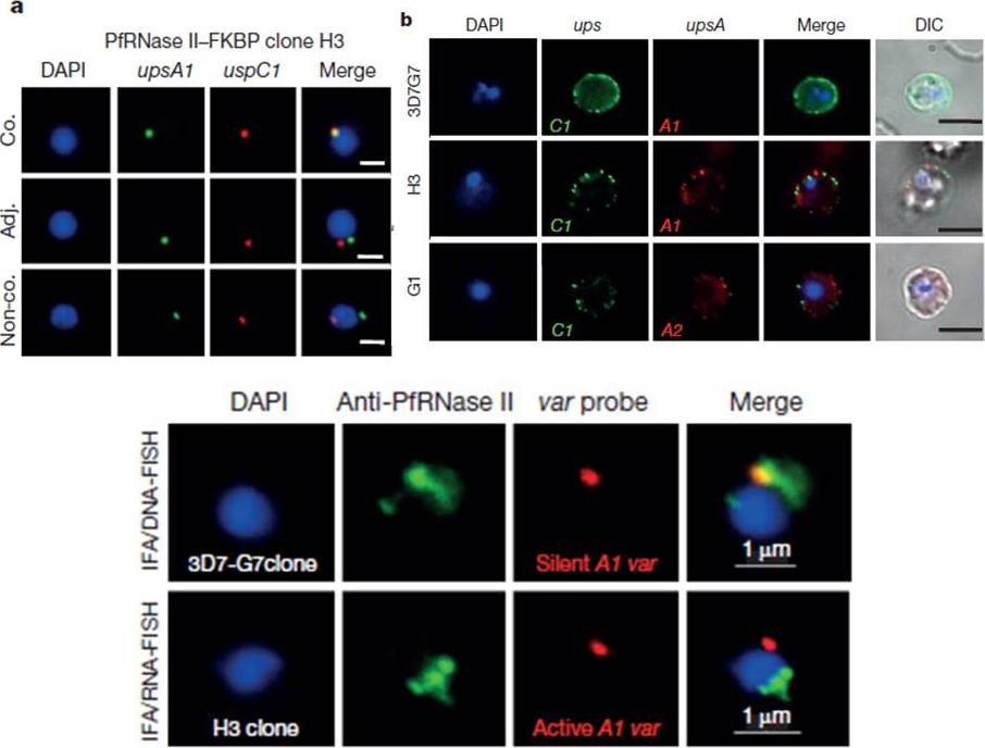 Monoallelic expression of var gene family is controlled by chromatin-associated RNase II (PFI0295c). a, Two-colour RNA-FISH of var transcripts in PfRNase II–FKBP-H3 and G1 clones. Red, UpsC-type C1 var probe (PFD0625c); green, upsA-type A1 var (PFF0020c). Co., co-localization; adj., adjacent; non-co., non-co-localization. Nuclear DNA was stained by DAPI (blue). Scale bar, 1 mm. b, Live-cell IFA using antisera to various PfEMP1s to detect co-expression of var genes in PfRNase II–FKBP H3 and G1 clones, respectively. The 3D7-G7 control expresses only one type of PfEMP1 (C1 var). Scale bar, 5 mm. c, PfRNase II is linked to the silent var-associated loci. Left: combined FISH/IFA assay using anti-PfRNase II antibody (IFA) with a FISHprobe (PFF0020c) that detected the upsA var expression site (RNA-FISH) in PfRNase II–FKBP clone H3. The same upsA var gene (DNA-FISH/IFA) was also analysed in ring-stage 3D7-G7 parasites.Zhang Q, Siegel TN, Martins RM, Wang F, Cao J, Gao Q, Cheng X, Jiang L, Hon CC, Scheidig-Benatar C, Sakamoto H, Turner L, Jensen AT, Claes A, Guizetti J, Malmquist NA, Scherf A. Exonuclease-mediated degradation of nascent RNA silences genes linked to severe malaria. Nature. 2014 Jun 29.
