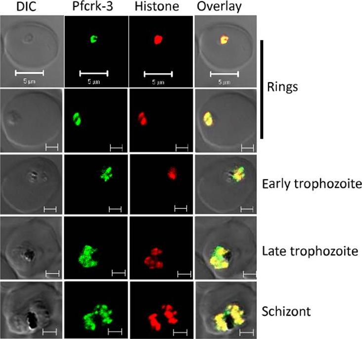 Images captured by laser scanning confocal microscopy show substantial co-localization of Pfcrk-3 (green) with nuclear-localized histones (red). P. falciparum 3D7 parasites were fixed with 4% paraformaldehyde / 0.0075% glutaraldehyde and probed with chicken IgY anti-Pfcrk-3 and mouse IgG anti-histone antibodies. The data in each row represent the fluorescence profile in ring stage parasites, early trophozoites, late trophozoites, and schizonts, respectively. In some ring-stage parasites (e.g. the top row appears to localize at the periphery of the nucleus, DIC: Differential interference contrast. Scale bar = 2 mm, except for the top row, where it is 5 mm.Halbert J, Ayong L, Equinet L, Le Roch K, Hardy M, Goldring D, Reininger L, Waters N, Chakrabarti D, Doerig C. A Plasmodium falciparum transcriptional CDK-related kinase with a crucial role in parasite proliferation associates with histone deacetylase activity. Eukaryot Cell. 2010 9:952-959.