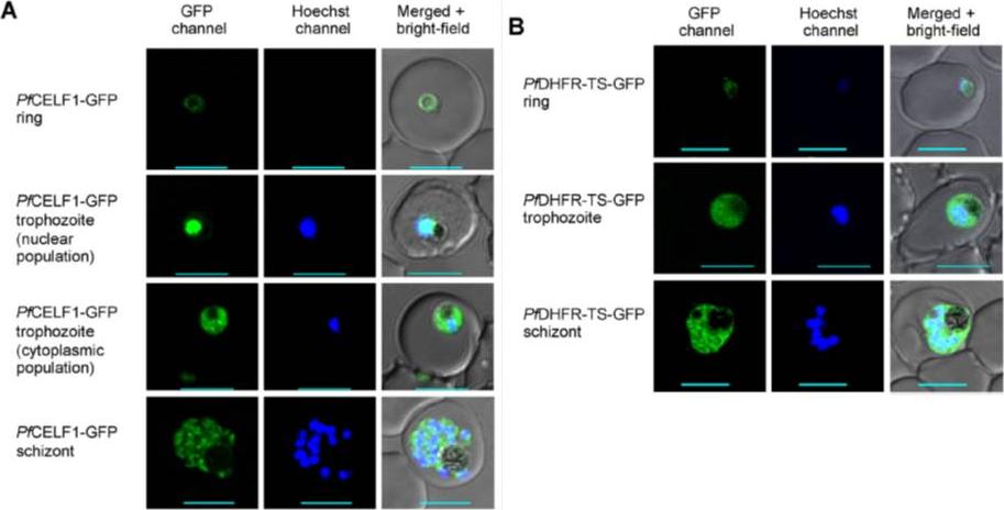 Protein localization of PfCELF1 and PfDHFR-TS. PfCELF1 was expressed as a fusion protein with C-terminal GFP in a transgenic parasite line established in 3D7 strain. The integrant transgenic line clone #1 expressing GFP-tagged PfDHFR-TS established in 3D7 strain for comparison was described previously [36]. (A) Representative confocal microscopic images of transgenic PfCELF1-GFP parasites. Images are shown for each asexual developmental stage (ring, trophozoite and schizont); left panel is the GFP signal showing PfCELF1-GFP, middle panel is Hoechst signal showing nucleus and right panel is the merge of both fluorescent signals overlaid with the bright-field image. Scale bars, 5 mm. (B) Representative confocal microscopic images of transgenic PfDHFR-TS-GFP parasites. Images are shown for each asexual developmental stage and arranged as in part A. Scale bars, 5 mm. Wongsombat C, Aroonsri A, Kamchonwongpaisan S, Morgan HP, Walkinshaw MD, Yuthavong Y, Shaw PJ. Molecular characterization of Plasmodium falciparumBruno/CELF RNA binding proteins. Mol Biochem Parasitol. 2014 Nov 3;198(1):1-10. [Epub ahead of print]