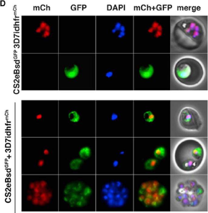 Communication between Parasites Results in the DNA-Dependent Transfer of Drug Resistance and Fluorescence.. Fluorescence microscopy of live 3D7idhfrmCh (mCherry) and CS2eBsdGFP (GFP) cocultured. Top, 3D7idhfrmCh expression of mCherry (red) in nucleus. Second panel, CS2eBsdGFP expression of GFP in cytoplasm. Bottom, examples of CS2eBsdGFP+3D7idhfrmCh cocultures in Bs+WR after 5 days. DAPI-stained images (blue) show the nucleus and final image merged.Regev-Rudzki N, Wilson DW, Carvalho TG, Sisquella X, Coleman BM, Rug M, Bursac D, Angrisano F, Gee M, Hill AF, Baum J, Cowman AF. Cell-Cell Communication between Malaria-Infected Red Blood Cells via Exosome-like Vesicles. Cell. 2013 May 23;153(5):1120-33.